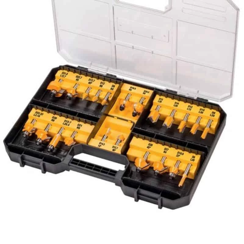 Le coffret DT90017 de Dewalt est très résistant et comprend un ensemble de lames circulaires, à rainures en V, à queue d’aronde, en anse, en dos d’âne, à chanfrein, droites, de détourage et tournées. Offrant une coupe à cisaillement progressive, vos découpes sont lisses et propres pendant l’usinage et la finition.