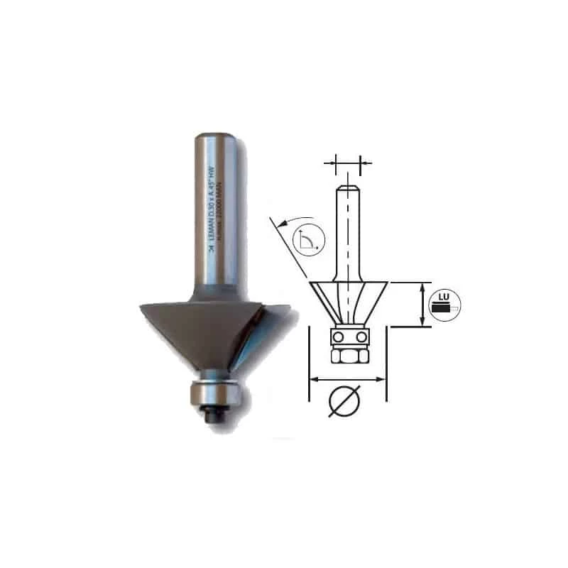 Mèche 3 coupes. Chanfreinage des chants dans les bois durs et panneaux mélaminés en suivant un gabarit.